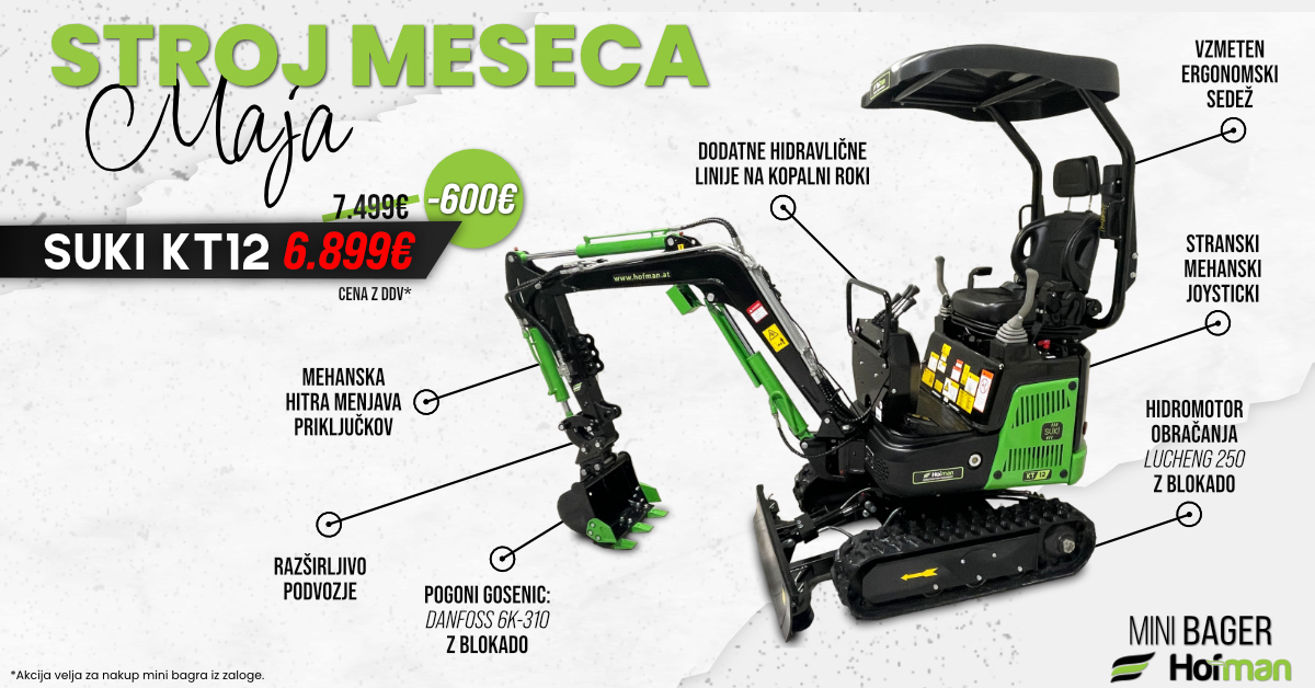Mini bager SUKI KT12 je idealna izbira za uporabnike, ki potrebujejo kompakten, a zmogljiv stroj za vsakodnevna zemeljska dela. Opremljen je z zračnim, štiritaktnim motorjem KOOP ter mehansko hitro menjavo priključkov za enostavno uporabo. S težo 1050 kg in razširljivim podvozjem omogoča stabilno delo ter odlično okretnost, zato je primeren tudi za ožja in težje dostopna delovišča.
